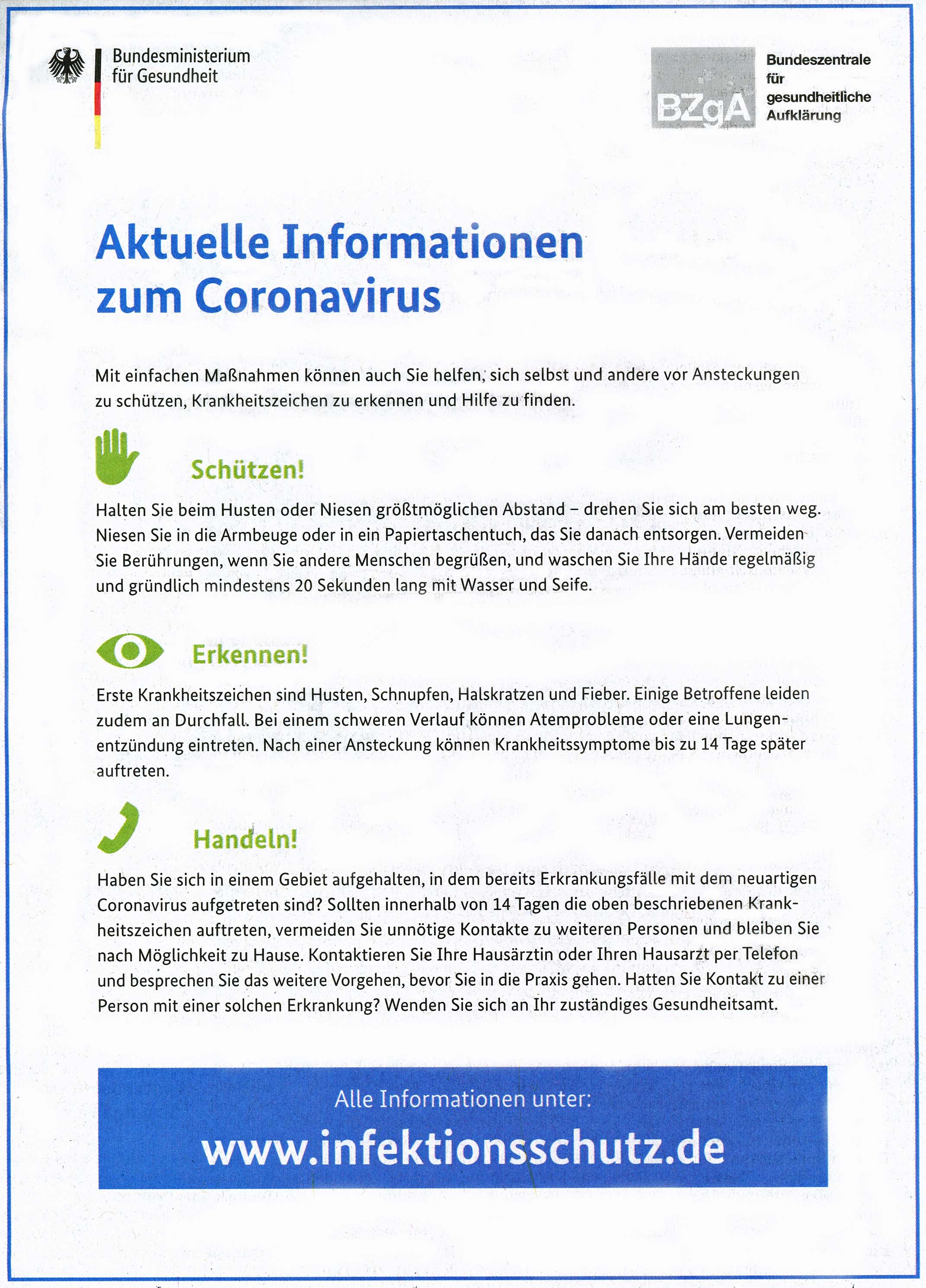 in den kommenden Wochen erwarten wir eine zunehmende Zahl von Menschen, die sich mit dem neuartigen Corona-Virus infizieren werden. Das ist nicht mehr zu verhindern, nach derzeitigem Kenntnisstand aber auch kein Grund für ungerechtfertigte Panik.